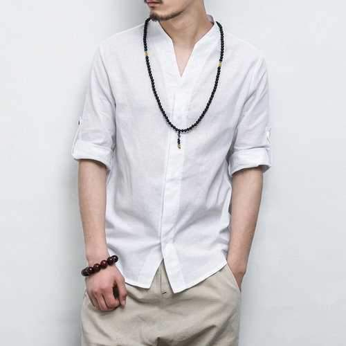 Linen Three Quarter Sleeve Shirts - WHITE / L