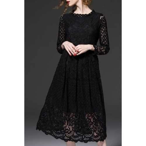 Elegant Round Neck Long Sleeve Openwork Lace Hook Women's Midi Dress - Black L - BLACK / L