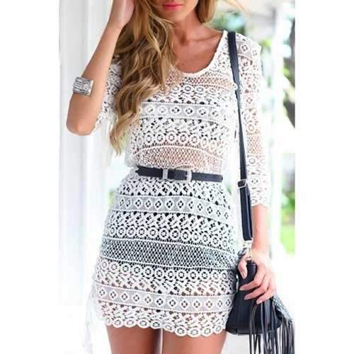 Stylish Round Neck 3/4 Sleeve White See-Through Lace Women's Dress - White S - WHITE / S
