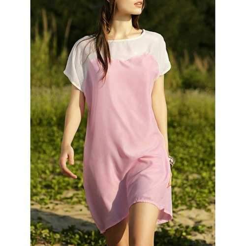 Casual Boat Neck Batwing Sleeve Two-Tone Women's Dress - Pink S Sale
