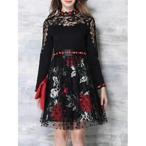 Flower Embroidered Long Sleeves Lace Spliced Dress - Black Xl - BLACK / XL