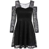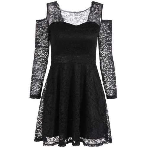 Cold Shoulder See Through Long Sleeve Lace Skater Mini Dress - Black One Size Sale