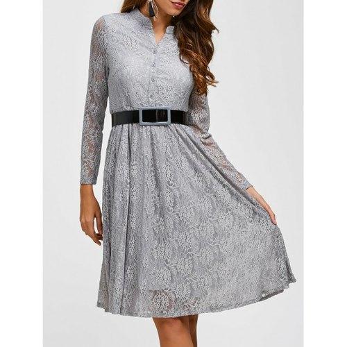 Lace Belted Long Sleeve Pleated Dress - Gray M - GRAY / M