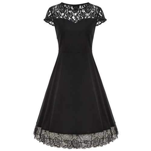 Lace Trim Cap Sleeve Flare Dress - Black S Sale