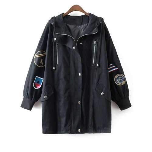 Hooded Patched Embroidered Trench Coat - Black One Size Sale