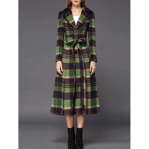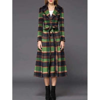 Wool Checked Long Skirted Coat - Green L - GREEN / L